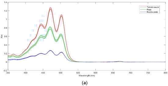 (a) UV–Vis spectra of tomato sauce (red line), ragù (green line), and ricotta pesto (blue line) at day 0; (b) UV–Vis spectrum of Genoese pesto at day 0.