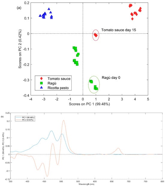 (a) PC1 vs. PC2 scores plot obtained by the PCA analysis of UV–Vis dataset; the red ellipse highlights tomato samples at day 15 and the green one highlights ragù samples at day 0. (b) Loading plot of PC1 (blue line) and PC2 (red line) of PCA applied on UV–Vis dataset.