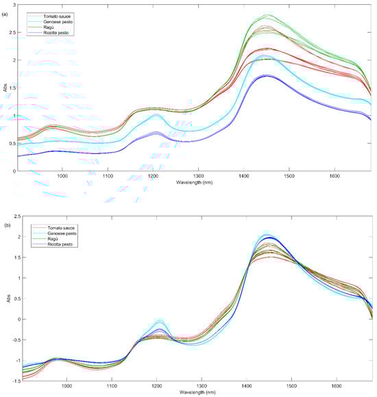 (a) Raw NIR spectra of all sauces at day 0; (b) NIR spectra at day 0 after SNV pretreatment.