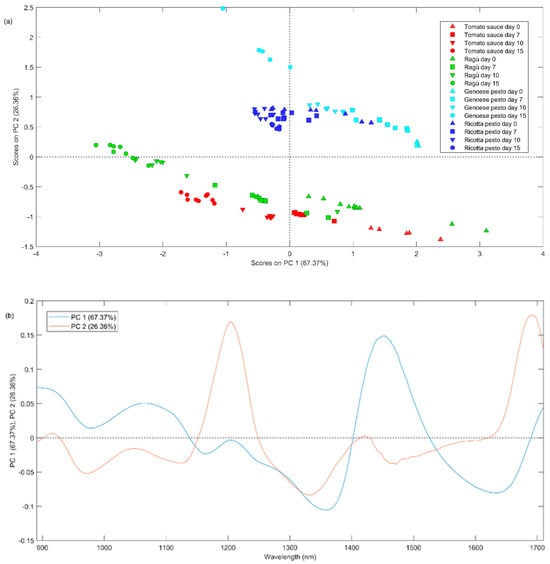 (a) Scores plot and (b) loadings plot of PC1 vs. PC2 of PCA applied on NIR dataset for days 0, 7, 10, and 15.