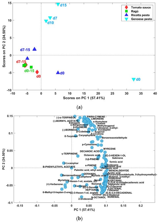 The loadings plot, in Figure 6b, shows that these samples are characterized by higher area values for a broad spectrum of volatile compounds. Furthermore, the distribution trends in scores among five types of sauces highlight distinct patterns, with Genoese pesto and ricotta pesto samples at day zero (positive PC1 scores) with a more intensive VOC profile. In addition, for each type of sample, those at time zero display higher scores in PC1 compared to those stored at 7, 10, and 15 days. Moreover, the latter group appears to have a stable aromatic composition, as most samples cluster closely together. This suggests that when samples are stored at 4 °C, their volatile composition undergoes an important change from 0 to 7 days of storage, after that, it remains relatively stable. From the PC1 vs. PC2 loadings plot in Figure 6b, it is evident that samples at day 0, located on the positive side of PC1 scores, are characterized by a higher content of almost all volatile compounds.