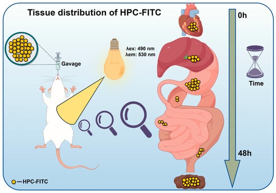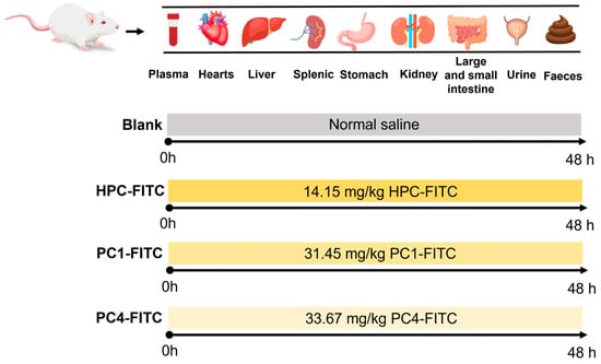 ICR mice (SPF grade, 30 ± 4 g, male) were purchased from Liaoning Changsheng Biotechnology Co., Ltd. (Shenyang, China) under the Certificate of Conformity No. SCXK-Liao-2023-074, and the animal experiments were approved by the Animal Ethics Committee of the Ocean University of Dalian (No. DLOU-20231116). The animals were housed in a 12 h circadian light cycle, after seven days of acclimatisation, as shown in Figure 1 and were divided into four groups according to the gavage samples: blank (normal saline); HPC-FITC (14.15 mg/kg); PC1-FITC (31.45 mg/kg); and PC4-FITC (33.67 mg/kg). All mice were fasted before the experiment, but were allowed to drink freely. Samples were given 48 h before execution, and after gavage, five mice were randomly selected at different time points (0.5, 1, 2, 4, 6, 8, 12, 24, 48 h) (Figure 1). Blood was collected from the orbits and then the spine was dislocated and killed, and blood, heart, liver, spleen, stomach, kidney, small intestine, large intestine urine, and faeces were collected for subsequent analysis. Tissue samples were rinsed with saline using absorbent paper to dry the surface water and weighed, added with appropriate amount of PBS solution (pH = 7.2) to prepare as 10% tissue homogenate, and the fluorescence intensity of polyphenol–polysaccharide complex in plasma and tissues was determined at different time points. They were cared for in accordance with the National Research Council’s Guide for the Care and Use of Laboratory Animals.