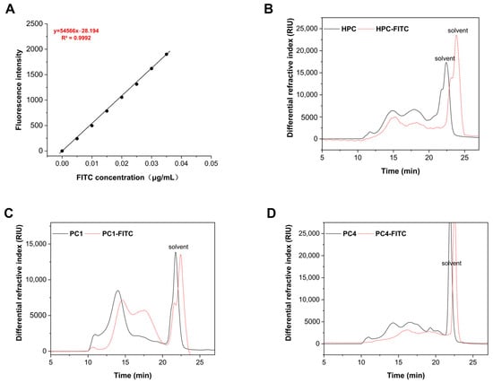 The regression equation curve of FITC (A) and HPGPC spectra of samples and FITC-labelled samples: (B) HPC; (C) PC1; (D) PC4.