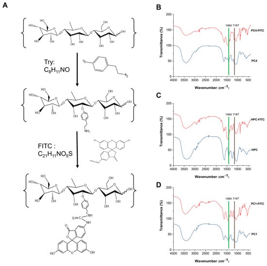 Fluorescence labelling process (A) of FITC and Fourier transform infrared spectroscopy of HPC-FITC (B), PC1-FITC (C), PC4-FITC (D).