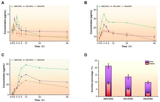 Oral HPC in mice—FITC, PC1—FITC, and PC4—FITC within 48 h of blood drug concentration (A); cumulative excretion of urine (B) and faeces (C); cumulative excretion of urine and faeces (D) over 48 h as a percentage of the dose administered.