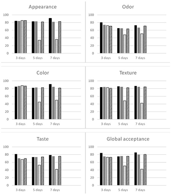 In relation to the acceptability index (Figure 1), as expected, the fresh sample obtained the best result (91.38%) for color, followed by appearance (91.11%) and texture (86.94%). It is noteworthy that regardless of the sealed packaging, at 5 and 7 days, all acceptability indexes of all treatments reached values above 60%, which is considered satisfactory.