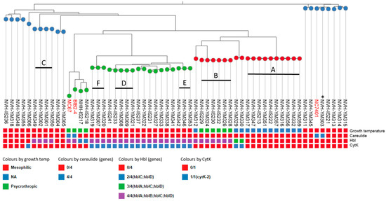 Distance-based Mashtree cluster analysis based on the genomes of 57 Bacillus cereus/B. weihenstephanensis isolates from a Norwegian ice cream production plant. Nodes are colored according to panC groups [38]. Squares are colored according to growth temperature characteristics, presence of CesNRPS genes (cereulide), and presence of the enterotoxin genes hblCDAB and cytK (see legends). The black lines indicate clusters (≥3 isolates) of highly similar isolates (A–F). Reference strains, one mesophilic emetic B. cereus strain (NC7401) and two psychrotrophic B. weihenstephanensis strains (BtB2-4 and MC67), are included in the three (in red). Asterisks (*) indicate the cereulide-producing B. cereus strain (NVH-YM303) isolated from ice cream. Not applicable (NA) is used for strains that do not grow at either 7 °C or 43 °C. An interactive version of the figure is available at https://microreact.org/project/eRgJS3G1gnrujCzrc5nhoD-ice-cream-bacillus, accessed on 14 June 2024.