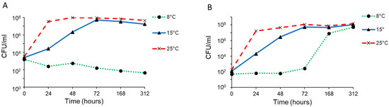 Growth in milk by B. cereus NVH-YM303 (A) and B. weihenstephanensis BtB2-4 (B) at 8 °C, 15 °C, and 25 °C for 312 h. The given values are mean of two independent replicates.