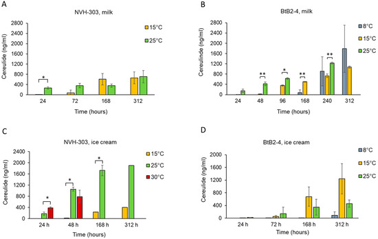Cereulide production in milk and ice cream by B. cereus NVH-YM303 ((A) and (C), respectively) and by B. weihenstephanensis BtB2-4 ((B) and (D), respectively) at different temperatures. NVH-YM303 did not produce cereulide at 8 °C in milk, and cereulide production by NVH-YM303 in ice cream at 8 °C was not tested. Error bars indicate standard deviations of results obtained from three independent replicates except for two replicates of NVH-YM303 in ice cream at 25 °C/312 h (C). Asterisks represent statistical differences from pairwise comparisons determined by two-tailed paired Student’s t tests (* p ≤ 0.01; ** p ≤ 0.05).