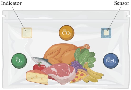 Illustration of food packaging with indicators and sensors attached inside the packaging to detect oxygen, carbon dioxide, or ammonia. Indicators show gas presence through color changes, while sensors provide quantitative data by converting this information into electrical signals. This system monitors microbial activity and environmental changes in real time [1,2,3].