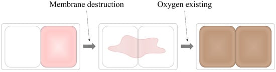 Similar to the pressure-activated compartmented oxygen indicator described in Section 3.1.3, this indicator is designed by separating its components [18,50]. This configuration allows for the control of activation timing, preventing unintended activation by oxygen in the air. Additionally, by separating the reducing sugar from the basic substance prevents the browning of the reducing sugar caused by the basic substance, thus addressing the instability issues of some dyes [50].
