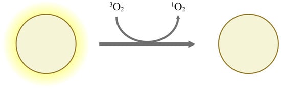Existing oxygen indicators primarily use colorimetric dyes that change color in the presence of oxygen. However, fluorescent dyes, which indicate the presence of oxygen through changes in light intensity rather than color, are also used. Photoluminescence-based oxygen indicators are created by encapsulating fluorescent dyes in silicon or organic polymers, such as vinyl chloride, which are gas-permeable but ion-impermeable. The detection mechanism involves collisional quenching, which occurs when a fluorescent dye in an excited state collides with oxygen molecules [29,39,48]. When short-wavelength light, such as UV rays, irradiates the fluorescent dye, energy is supplied to the dye, putting it into an excited state and causing it to emit light. If the excited fluorescent dye collides with an oxygen molecule in its ground state (triplet oxygen), the oxygen molecule absorbs energy from the dye and transitions to an excited state (singlet oxygen). Consequently, the fluorescent dye returns to its ground state, resulting in a reduction in light intensity (Figure 5). Photoluminescence-based oxygen indicators remain inactive until UV irradiation, allowing control over the activation time. This process is irreversible. Because the components are encapsulated within polymers, they are protected from leakage due to moisture. When using [Ru(dpp)3](ClO4)2, sensitivity varies depending on the encapsulation material. Silicon rubber (RTV118) has a sensitivity of 30 Torr, poly(vinyl chloride) has 132 Torr, and polystyrene has 495 Torr. Among the commercially available products, O2xyDot™ has a detection range of up to 15 µmol/dm3 in water and 0.03% in gas [29,39].