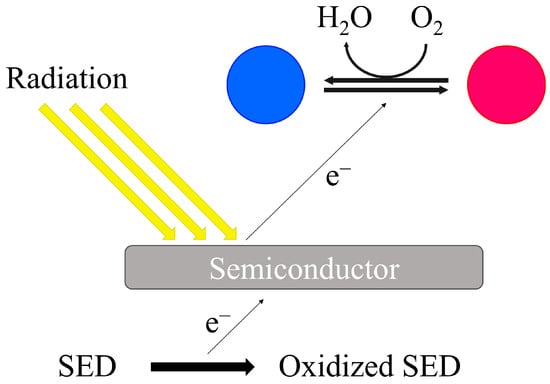 The detection and indication mechanism of light-activated colorimetric redox dye-based oxygen indicator. The semiconductor absorbs high-energy light, generating electron holes and electrons. Electron holes oxidize the electron donor, transferring electrons to the redox dye and causing a color change. In the presence of oxygen, the dye reverts to its original color, indicating the presence of oxygen [25,26,29,34,35,36,40,41,42,43,44,45].
