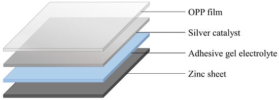 Self-powered flexible oxygen gas sensor components. The components include a metal cathode (zinc sheet), air anode (silver catalyst), and electrolyte (adhesive gel electrolyte), with the OPP film as the top layer [19].