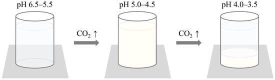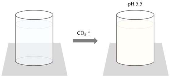 Among the indicators mentioned, a whey protein isolate (WPI)-based carbon dioxide indicator has been developed, similar to the chitosan-based irreversible colorimetric carbon dioxide indicator mentioned in Section 3.2.2, which utilizes pH-dependent solubility [15,16]. This WPI-based indicator reveals the presence of carbon dioxide through changes in transparency. The detection mechanism relies on the solubility of WPI, which varies with pH changes. WPI consists of proteins such as β-lactoglobulin and α-lactalbumin found in whey produced during the cheese-making process. Under neutral conditions, WPI is transparent; however, its solubility decreases near its isoelectric point of pH 5.5, causing it to become opaque. Thus, the principle of this indicator is based on the reaction of carbon dioxide with the water-soluble solvent of the indicator, leading to a pH decrease and a corresponding change in transparency (Figure 11). Even if the pH increases again, the indicator exhibits hysteresis, making its transparency change irreversible. This feature provides the advantage of permanently indicating the presence of carbon dioxide. Additionally, this indicator allows for the detection of carbon dioxide without requiring special equipment or expertise [15].