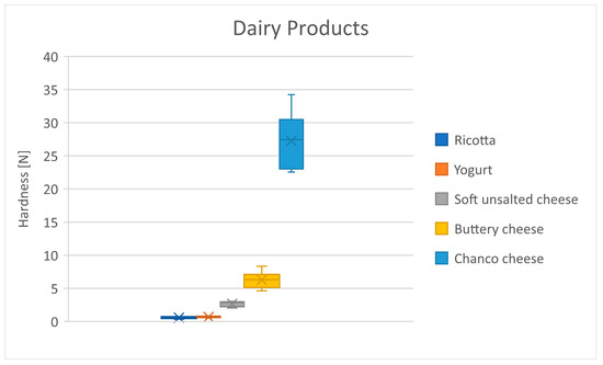 Table 10 shows the mean hardness differences in the dairy group. Dairy products present a slowly growing trend (Figure 2), from ricotta to buttery cheese, to chanco cheese, where the hardness increases significantly. Yogurt and soft unsalted cheese are the softest foods, as expected since they are semi-solid (Table 10).