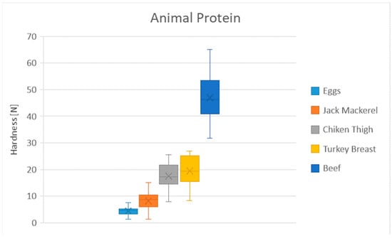 Table 11 shows the mean hardness differences in the animal protein group. A similar trend is observed until reaching beef, where the hardness increases significantly (Figure 3). Poultry meat, turkey breast, and chicken thigh have similar values. Eggs and jack mackerel cluster together at the lower hardness (Table 11).