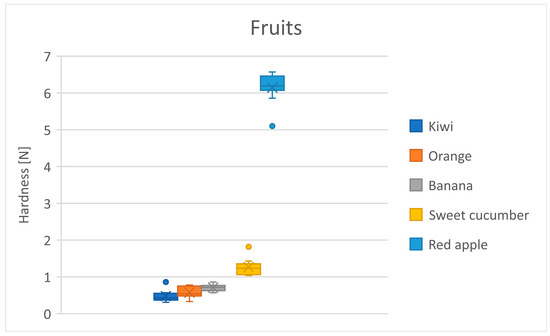 Each product was cut to achieve a sample 2 cm in height. Banana and sweet cucumber were cut in the center of the fruit [51]. For fruit testing, a Magnes Tylor probe was used according to the manufacturer’s recommendation.