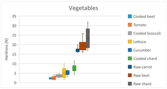 Table 13 shows the mean hardness differences in the vegetables group. In the vegetable group, raw vegetables exhibit greater hardness, not only compared to cooked ones, but also differ from the other vegetables by having a higher hardness (Table 13). Raw beetroot has hardness that is ten times greater than cooked beetroot. An increasing trend is observed in both the raw and cooked vegetable (Figure 5).