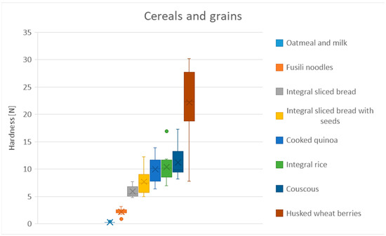 Distribution of hardness for cereals and grains products. Dots represent outliers. Crosses represent average.