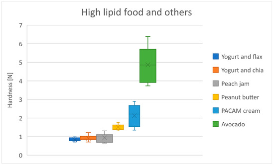 Distribution of hardness for high lipid food and other products. Dots represent outliers. Crosses represent average.