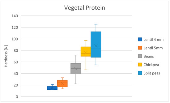 In the case of vegetal protein, this group comprised pulse foods: 4 mm and 5 mm diameter lentils (Lens culinaris), white beans (Phaseolus vulgaris), chickpeas (Cicer arietinum), and split peas (Pisum sativum). Testing and cooking conditions are provided in Table 8.
