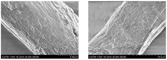 To perform scanning electron microscopy coupled with energy-dispersive X-ray spectroscopy (SEM-EDS), the MPs were extracted from the surface of the filters and placed on the double-adhesive carbon tape fixed on the support. Figure 2 shows the most representative SEM images obtained for microplastics from conventional and organic milk samples, their morphology being similar. It is characterized by finely textured surfaces, with medium roughness, and presents longitudinal fibers.