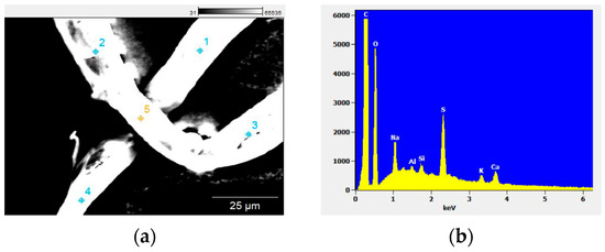 The MPs shown in Figure 3a were characterized by an average diameter of 15.5 µm and 2.87 mm in length. The elemental content of MPs was determined using the point and shoot EDS technique (Figure 3b).
