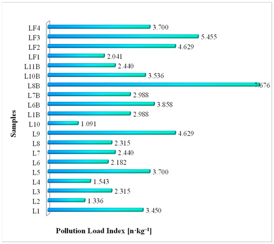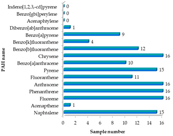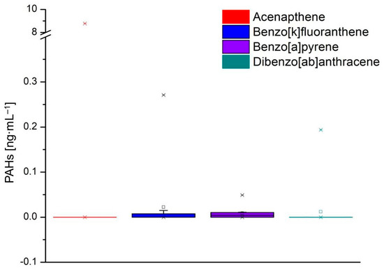 The values recorded for acenaphthene and dibenzo[a,b]anthracene were 8.772 ng·mL−1 and 0.194 ng·mL−1. The content of benzo[k]fluoranthene in the samples varied between 0.015 ng·mL−1 (L2) and 0.271 ng·mL−1 (L4). For benzo[a]pyrene, the minimum value recorded was 0.004 ng·mL−1 for samples L5, L10, and L6B, and the maximum value was recorded in sample L5.