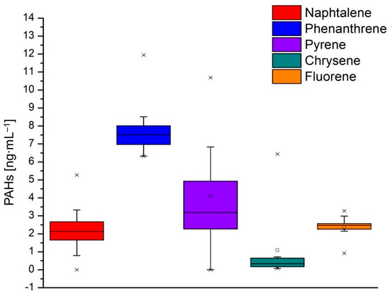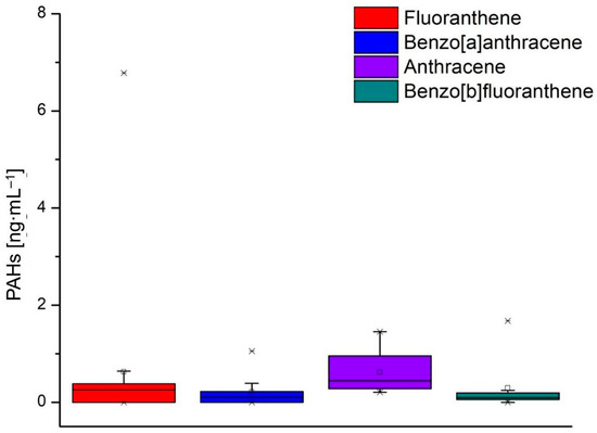 Figure 5, Figure 6 and Figure 7 show the values of the PAHs concentrations identified in the milk samples. The grouping of the compounds in the box-plot graphs was achieved concerning the number of samples in which they were identified and the quantity in which they were found. In addition, in the previously mentioned figures, the minimum, average, and maximum values of the identified concentrations are presented.