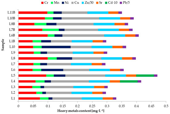 The first step in ICP–MS analysis of heavy metals (i.e., Cr, Cd, Pb, Ni, Cu, Mn, Zn, and Sr) was the assessment of the analytical sensitivity of the method by calculating the limit of detection (LOD) and limit of quantitation (LOQ). LOD and LOQ are the terms used to describe the smallest content that can be reliably detected or measured by an analytical procedure [38]. For this part of the study, seven blank solutions were prepared and analyzed by the same protocols as the samples. The values obtained for HMs content in blank solutions were used in Equations (4) and (5) to calculate LOD and LOQ: