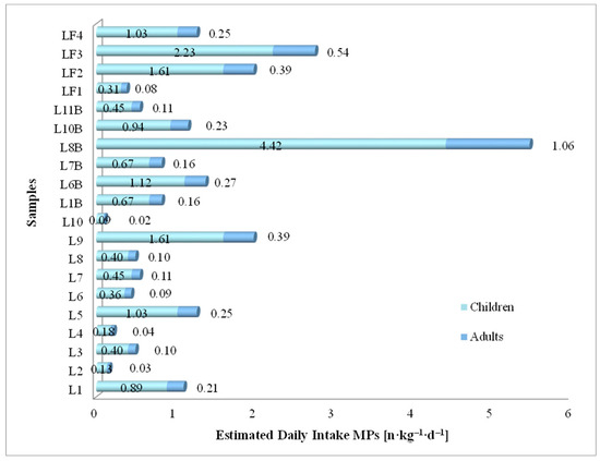 The microplastic pollution load index values recorded in conventional milk samples were between 1.091 and 4.629 n·L−1; in organic milk samples, it ranged between 2.440 and 7.676 n·L−1; in raw milk samples, it ranged between 2.041 and 5.455 n·L−1 (Figure 9). The human risk of MPs intake through the consumption of milk expressed as estimated daily intake ranged from 0.09 to 4.42 n·kg−1·d−1 for children, while for adults, the values ranged from 0.02 to 1.06 n·kg−1·d−1 (Table 9, Figure 10).