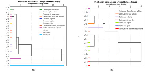 One method used to determine the relatively homogeneous groups based on predefined characteristics (MPs composition) is hierarchical cluster analysis. The hierarchical groups created for the milk categories (conventional, organic, and raw) are shown in Figure 11, with the type and nature of microparticles serving as default variables. The dendrograms for each milk category were made up of microplastics as follows: 27 MPs from conventional milk and 16 MPs from organic and raw milk. In the case of conventional milk, the cluster analysis grouped the 25 MPs in conjunction with Table S3 into ten distinct clusters, while the 16 MPs from organic and raw milk in conjunction with Tables S4 and S5 were grouped into 7 and 5 clusters, respectively. MPs from the three categories of milk have in their composition polymeric compounds such as poly(methyl methacrylate, polyamides, polyurethane, polyester, polyethylene, as well as natural organic compounds such as cotton, cellulose, and flax.