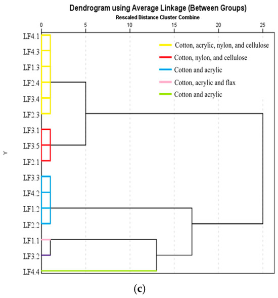 Dendrogram plot tab—distribution of MPs from (a) conventional, (b) organic, and (c) raw milk samples.