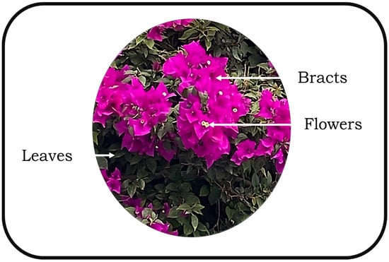 Bougainvillea bracts and flowers were carefully collected from Bougainvillea spectabilis plants in Pachuca, Hidalgo, Mexico, from January to April 2023. For the preparation of bougainvillea powders, both the flowers and bracts were considered since it has been described that these parts contain the highest concentration of bioactive compounds of interest [].