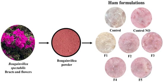 Bougainvillea spectabilis, commonly known as bougainvillea, is renowned for its colorful bracts (Figure 1) due to the presence of natural coloring pigments such as betalains (betacyanin and betaxanthins), with interesting chemical properties. On the other hand, bougainvillea also contains compounds such as flavonoids, alkaloids, phenols, and tannins, which contribute to its potential as a natural additive [,]. These components show strong antioxidant activity and potential anti-inflammatory and anticancer properties and liver-protective effects []. Recently, Abdelrahman et al. [] have reported the antioxidant and antimicrobial activity of phenolic acids, specifically anthocyanins, from bougainvillea and their in vitro inhibitory effect on the viability of certain cancer cells. This flower has been used in Mexican folk medicine as a tea for treating respiratory diseases [,,,,,], suggesting potential benefits for food preservation. Kaushik et al. have described the applications of Bougainvillea spectabilis in food products. It has been mentioned that bougainvillea has been incorporated into noodles, pasta, juice, macaroni, frozen desserts, beverages, milk products, tablets, and syrup as the coloring agent. It has been described that this plant could be considered for the food and pharmacy industries []. However, it is important to note that comprehensive studies on the safety and efficacy of incorporating bougainvillea extracts into meat products are limited. Further research is essential to understand the specific advantages and potential challenges associated with utilizing Bougainvillea spectabilis in the context of meat and meat products.