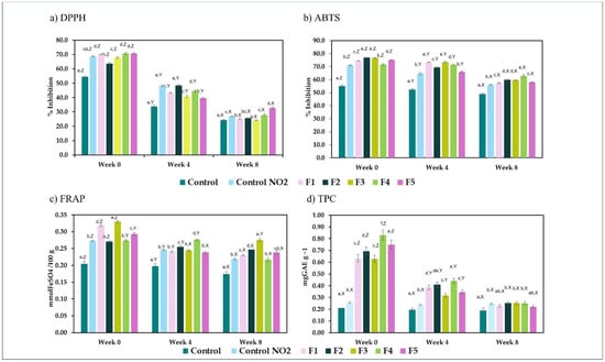 Effect of the addition of bougainvillea powder on the antioxidant activity measured in ham with (a) DPPH method, (b) ABTS method, (c) FRAP method, and (d) total polyphenolic content method. a–f mean values for each week with different letters differ significantly (p < 0.05), X–Z mean values for each formulation with different letters differ significantly (p < 0.05).