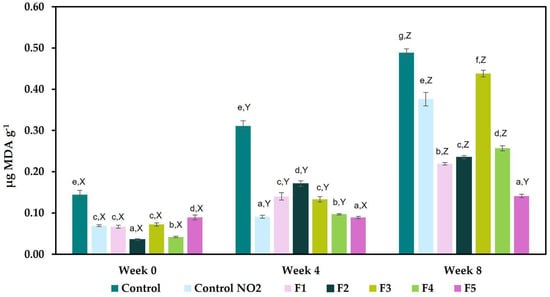 Effect of the addition of bougainvillea on the content of thiobarbituric acid reactive substances (TBARS assay) in mg MDA/kg. a–g mean values for each week with different letters differ significantly (p < 0.05). X–Z mean values for each formulation with different letters differ significantly (p < 0.05).