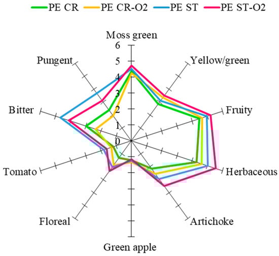 Sensory profiles of Peranzana virgin olive oils obtained with four different modalities of fruit breaking: crushing (PE CR), crushing including 0.2 L/min of O2 addition (PE CR-O2), stoning (PE ST), and stoning including 0.2 L/min of O2 addition (PE ST-O2). Results show significant differences (p < 0.05) among processes.