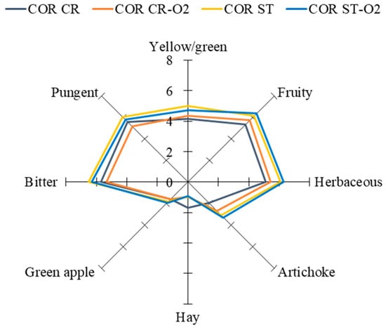Sensory profiles of Coratina virgin olive oils obtained with four different modalities of fruit breaking: crushing (COR CR), crushing including 0.2 L/min of O2 addition (COR CR-O2), stoning (COR ST), and stoning including 0.2 L/min of O2 addition (COR ST-O2). Results show significant differences (p < 0.05) among processes.