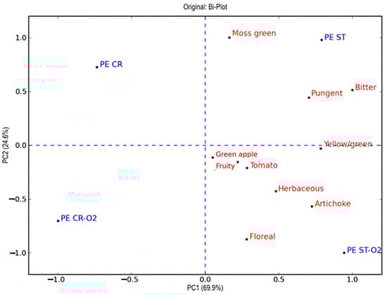 The score plot of the Peranzana cultivar, shown in Figure 3, explained 94.5% of the variance with two components. The first principal component explained 69.9% of the total variance and differentiated the samples according to the olive-breaking process, traditional hammer crusher, and stoning. For the first component, the olive-breaking procedure applied clearly affected the sensory profiles of the EVOOs: on one side were the EVOOs produced by the traditional hammer crusher, and on the other side were those obtained by stoning. The sensory descriptors that discriminated the samples among the two components, in order of relevance, were “pungent”, “bitter”, “yellow/green”, “artichoke”, and “herbaceous”. The differences between the EVOOs obtained by traditional crushing and those produced by stoning were identified mainly for these attributes that, as previously pointed out, are related to the concentration of phenols and volatile compounds such as the C5 and C6 aldehydes. The second component, which explained 24.6% of the total variance, shows a clear discrimination between the EVOOS produced using traditional crushing or stoning with and without the oxygen addition. In fact, the addition of oxygen affected the separation of the samples along the second component.