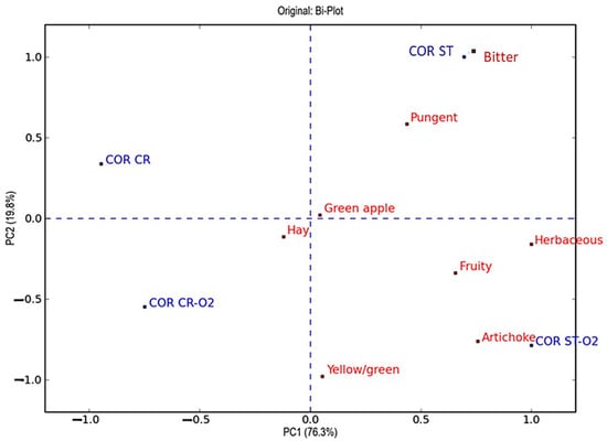 The PCA score plot related to the EVOOs produced from the cultivar Coratina, reported in Figure 4, explained 96.1% of the total variance with two principal components. The first component, which explained 76.3% of the total variance, discriminates the samples in two clusters according to the olive-breaking process, traditional hammer crusher and stoning, respectively. For the olfactory sensory notes, the discrimination along the first component was explained by the intensity of “herbaceous”, “artichoke”, and “fruity” sensory attributes that were higher for the EVOOs produced by stoning. As already pointed out for the oils obtained from the Peranzana cultivar, the intensity of these sensory notes is associated with the concentrations of the C5 and C6 aldehydes [], which, as reported in Table 3, were higher for the EVOOs produced by stoning. For the gustative sensory attributes, the discrimination of EVOOs was associated with the intensity of “bitter” and “pungent” sensory attributes, which were higher for the EVOOs produced by the stoning process, in agreement with the differences in the phenolic concentration reported in Table 2. Relative with the second principal component, which explained 19.8% of the total variance as observed for the EVOOs produced by Peranzana cultivar, the samples were discriminated according to the oxygen addition in the pastes during processing. The samples discrimination was explained according to the intensity gustative attribute, such as “bitter” and “pungent”, and by the “artichoke” attribute for the olfactive sensory notes.