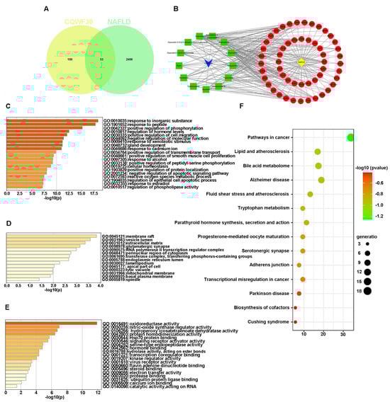 Identification of CQWF30 components and screening of components relevant to NAFLD intervention. Venn diagram illustrating the potential targets of CQWF30 in NAFLD intervention (A). The protein-protein interaction (PPI) network of 53 potential targets modulated by 13 flavonoids in CQWF30 in the context of NAFLD (B). Gene Ontology (GO) enrichment analysis of biological processes for the potential targets (C). GO enrichment analysis of cellular components for the potential targets (D). GO enrichment analysis of molecular functions for the potential targets (E). KEGG pathway enrichment analysis for the potential targets (F).