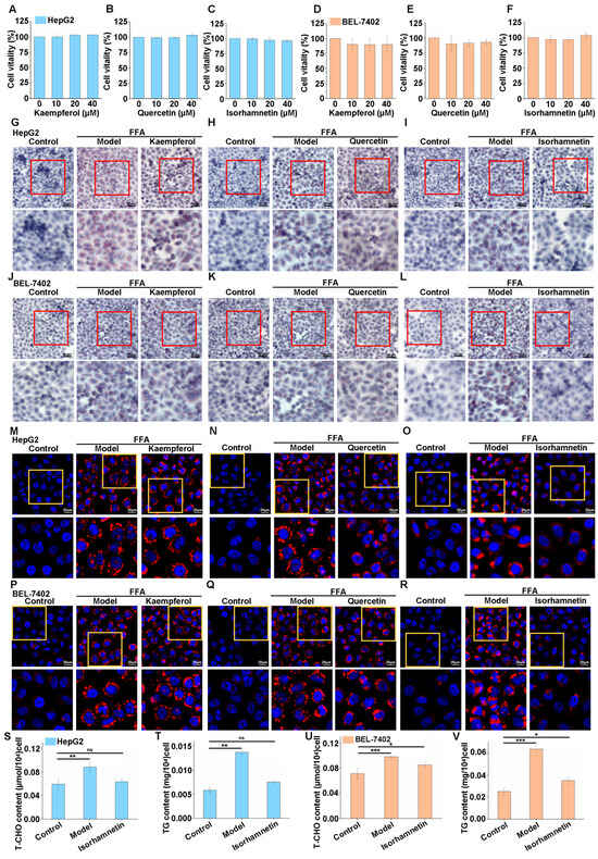 Effects of isorhamnetin on lipid accumulation and cell viability. Effects of kaempferol (A), quercetin (B), and isorhamnetin (C) on the viability of HepG2 cells and effects of kaempferol (D), quercetin (E), and isorhamnetin (F) on the viability of BEL-7402 cells. Oil red O staining and Nile red fluorescence staining showing the effect of 10 μM kaempferol, quercetin, and isorhamnetin on lipid droplets in FFA-induced (at a volume ratio of OA to PA 2:1, 1 mM for HepG2) HepG2 cells (G–I,M–O). Oil red O staining and Nile red fluorescence staining showing the effect of 10 μM kaempferol, quercetin, and isorhamnetin on lipid droplets in FFA-induced (0.5 mM for BEL-7402) BEL-7402 cells (J–L,P–R). The scale bar for Oil red O staining is 50 μm and 20 μm for Nile red fluorescence staining. T-CHO and TG content in HepG2 cells (S,T). T-CHO and TG content in BEL-7402 cells (U,V). The images below are enlarged views of the red or yellow frames in the upper image. * p < 0.05, ** p < 0.01, *** p < 0.001, ns, not statistically significant.