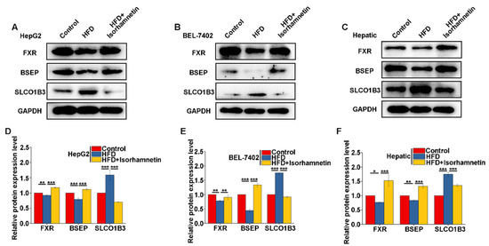 To further validate this hypothesis, we examined the expression of FXR, BSEP, and SLCO1B3 in HepG2 cells, BEL-7402 cells, and mouse liver tissues. The results indicated that the expression levels of FXR and BSEP were significantly reduced, while SLCO1B3 was elevated in the HFD group compared to the control. However, after the intervention of isorhamnetin, the expression levels of FXR and BSEP significantly rebounded and the SLCO1B3 level was significantly decreased (Figure 6A–F).
