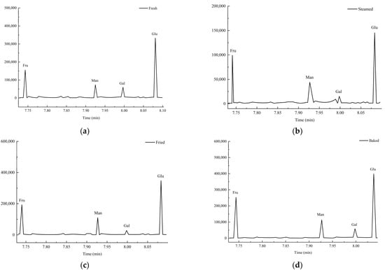 The monosaccharide composition spectrum of four polysaccharide samples. (a) Fresh; (b) Steamed; (c) Fried; (d) Baked. Note: Fru, D-Fructose; Man, D-Mannose; Gal, D-Galacturonic; Glu, Glucose.