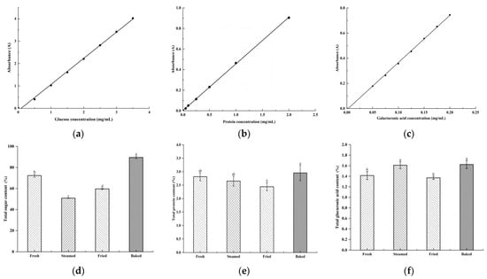 (a) the total sugar content measured for different thermally treated polysaccharides; (b) the protein content of the four sweet potato polysaccharides; (c) the total uronic acid content in the polysaccharides of steamed and baked sweet potatoes was remarkably different from that of fresh and fried sweet potatoes; Total sugar content (%) (d), total protein content (%) (e), and total glucuronic acid content (%) (f) of the four sweet potato polysaccharides. Note: Different lowercase letters indicate significant differences (p < 0.05).