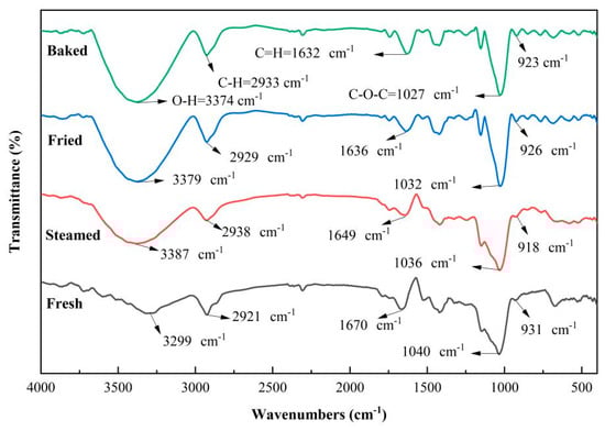 The results showed no significant changes in the infrared spectra of sweet potato polysaccharides after different thermal processing treatments, indicating that heat processing has no remarkable influence on the characteristic functional groups and chemical bonds of sweet potato polysaccharides. Likewise, several other studies have reached a similar conclusion. For example, Li et al. [32] found that the infrared spectra of Pleurotus eryngii showed no significant changes in polysaccharide functional groups and chemical bonding after cooking treatment. Dong et al. [33] reported no significant difference in the infrared spectra of oat dextran before and after heat processing treatments and that the steaming and microwave treatments did not change the functional groups.