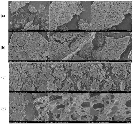 Scanning electron micrographs of raw sweet potato polysaccharides and three thermal processing treatments of sweet potato polysaccharides. ×1500, ×3000, and 4000. (a) Fresh; (b) Steamed; (c) Baked; (d) Fried.