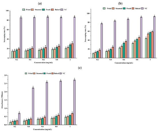 Based on the reduction of oxidized intermediates, the reducing capacity can reflect the potential antioxidant activity of many components of food and chemicals in plants [38]. The reducing capacity of sweet potato polysaccharides was expressed as absorbance at 700 nm. Figure 6c shows the reducing power of the four sweet potato polysaccharides, showing their reducing power is concentration-dependent. Baked sweet potato polysaccharides had the strongest reducing power, while fried sweet potato polysaccharides had the weakest. At the same concentration, the reducing power of VC was significantly higher than that of the four sweet potato polysaccharides (p < 0.05). There were also significant differences in reducing power among the four sweet potato polysaccharides (p < 0.05). The above evidence suggests that sweet potato polysaccharides can be used as a potential natural antioxidant for use as a medicine or functional food. Yuan et al. [39] found that purple sweet potato polysaccharides significantly reduced oxidative damage, which was consistent with the results of the antioxidant activity of sweet potato polysaccharides in this study. Studies have reported that other polysaccharides also have a certain antioxidant capacity. As a recent example, Chen et al. [40] extracted crude polysaccharides from cushaw using the hot water extraction method and proved it had a good antioxidant effect.